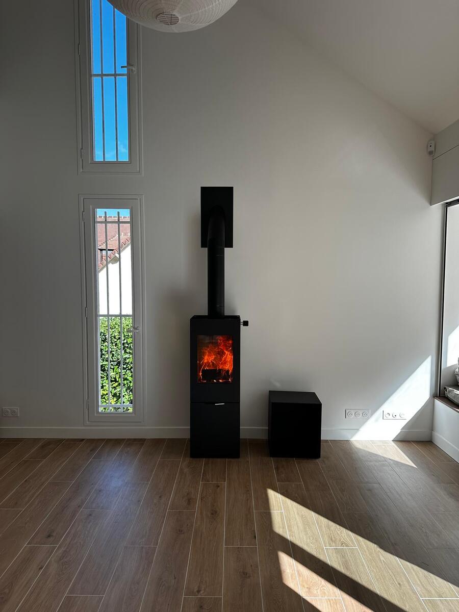 Poêle à bois en acier noir au design moderne, offrant une excellente diffusion de chaleur. Elégant et efficace, il s’intègre parfaitement dans la maison tout en assurant un chauffage performant et écologique.
